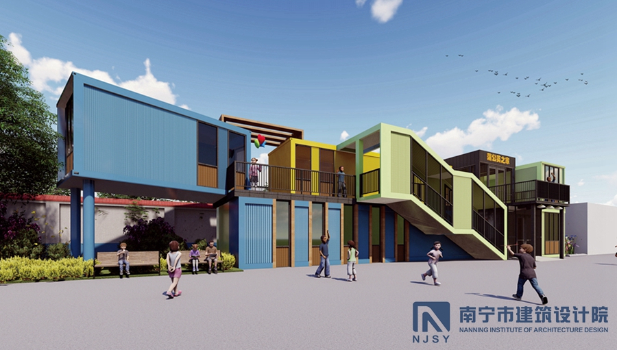 項目采用了集裝箱房屋的形式,由10個(gè)集裝箱構成,通過(guò)堆積木的形式,根據學(xué)生兒童所需的建筑風(fēng)格和功能需求,將集裝箱橫豎排列,形成一定的退臺和露臺空間,為孩子們提供更多共享活動(dòng)空間。